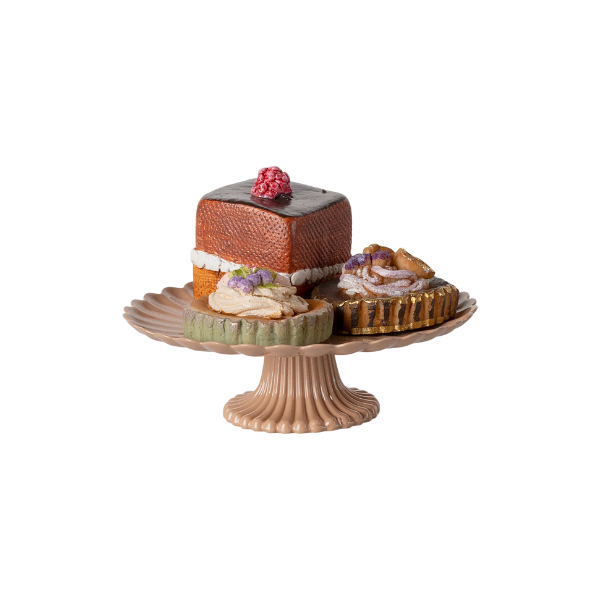 El diseño de este set refleja toda la atención al detalle que caracteriza a Maileg: los pasteles, elaborados en polyresina, imitan a la perfección texturas, colores y acabados de los dulces reales. Cada pieza está pintada a mano, lo que convierte a cada set en un pequeño tesoro único y artesanal. La pastelera, fabricada en metal, destaca por su delicado tono rosa y su forma clásica, inspirada en las reposteras tradicionales.