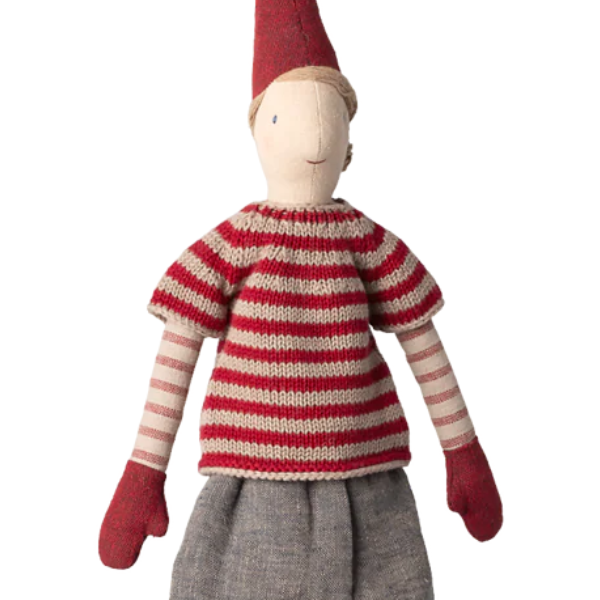 La Pixy Chica Tamaño 3 viste una preciosa camisa de algodón combinada con un suéter de punto de estilo tradicional, falda y el clásico gorro rojo de Navidad. Cada detalle de su vestimenta ha sido cuidadosamente confeccionado con materiales de alta calidad para ofrecer una pieza duradera, cálida y con el inconfundible encanto nórdico característico de Maileg.