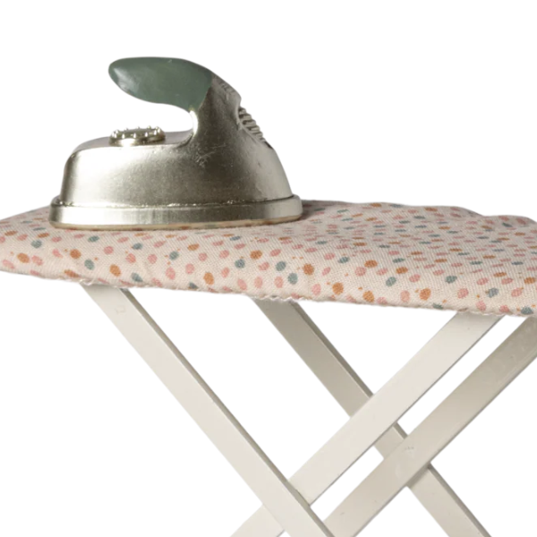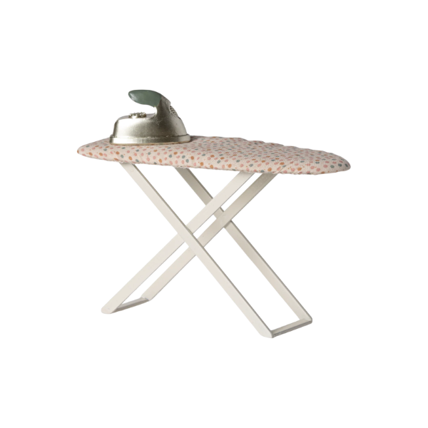 Este set incluye una tabla de planchar de metal y una plancha en miniatura, elaboradas con los característicos detalles artesanales que distinguen a Maileg. La tabla está recubierta con una tela de algodón estampada, con un diseño exclusivo que aporta un toque de color y autenticidad al conjunto. Cada pieza está cuidadosamente diseñada para encajar a la perfección en el universo Maileg, combinando la estética vintage con la funcionalidad del juego simbólico.