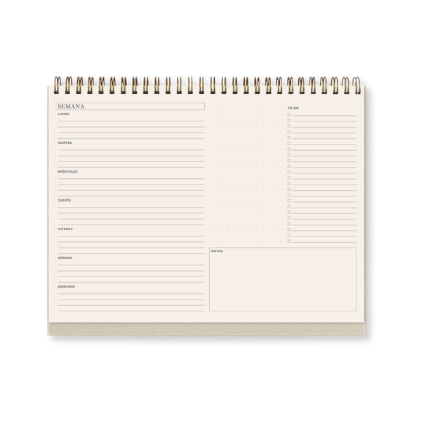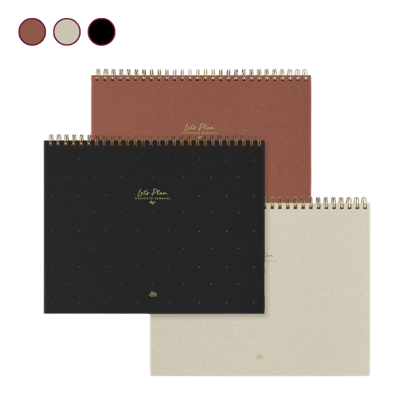 Las tapas enteladas en lino, disponibles en colores Black Night, Beige y Teja, aportan sofisticación y resistencia. Los detalles en stamping dorado refuerzan su acabado premium, creando un equilibrio perfecto entre diseño y funcionalidad. La elección de materiales de alta calidad, como el papel de 100 gsm en color ahuesado, garantiza una escritura suave y evita que la tinta traspase, manteniendo cada página impecable durante todo el año.