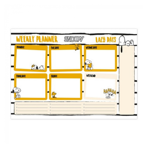 El planificador está decorado con ilustraciones relajantes de Snoopy en sus momentos más tranquilos, inspirando una organización sin estrés, bajo la temática “Lazy Days”. La encuadernación encolada permite arrancar fácilmente cada hoja al terminar la semana, manteniéndolo limpio y práctico.