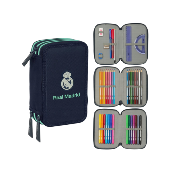El Plumier Triple Real Madrid Segunda Equipación 25/26 es ideal para estudiantes de primaria y secundaria, ya que incluye todo lo necesario para el colegio en un solo estuche, evitando compras adicionales y facilitando la organización diaria.