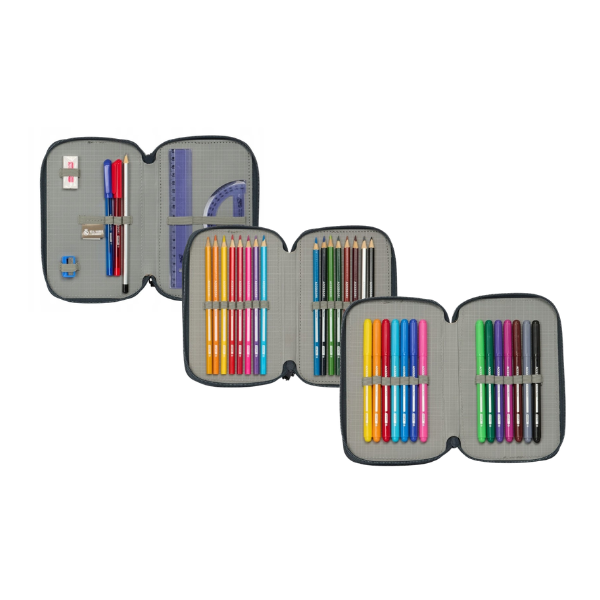 Este completo estuche escolar incluye un total de 36 piezas, cuidadosamente distribuidas en tres compartimentos independientes con cremallera, lo que permite mantener todo el material perfectamente organizado y accesible.