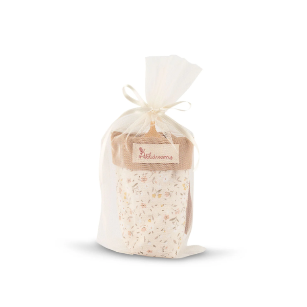 La presentación también está cuidada al máximo. El conjunto se entrega en una bolsa de tul beige con lazo, perfecta para guardar o regalar. Este envoltorio le da un aire especial, ideal para sorprender a los más pequeños en ocasiones como cumpleaños, Navidad o cualquier celebración especial.