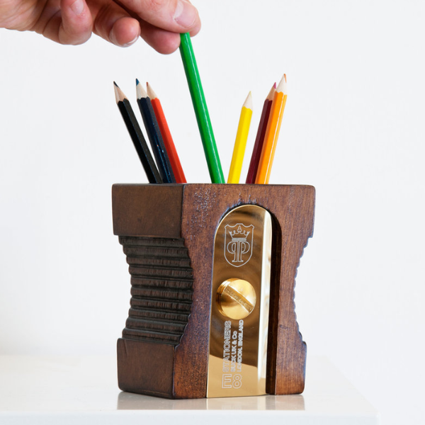 El Portalápices de Sacapuntas de Madera Oscuro es un organizador de escritorio con forma de sacapuntas gigante, fabricado en madera de caucho sostenible y con un detalle en acero inoxidable dorado. Su diseño clásico e icónico, creado por Jamie + Mark Antoniades para j-me y producido por Suck UK, lo convierte en una pieza única de papelería de diseño. Perfecto para mantener lápices y bolígrafos ordenados, mientras aporta un toque decorativo sofisticado.