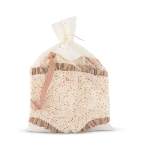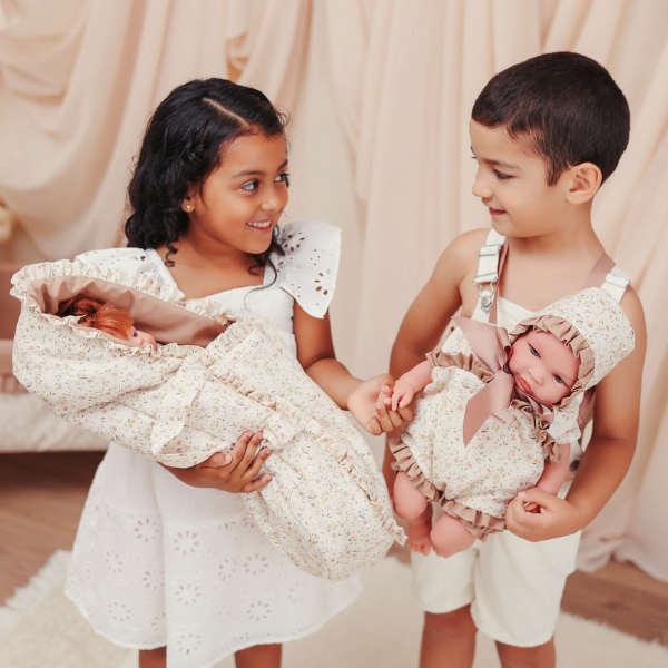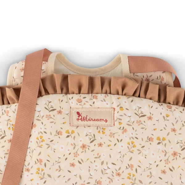 Confeccionado con tela de algodón de alta calidad, este portamuñecos destaca por su suavidad y durabilidad. La tela está decorada con un delicado volante de doble capa, característico de la Colección Teresa, que añade un toque elegante y distintivo. Cada costura ha sido cuidadosamente trabajada para ofrecer un acabado resistente y seguro, preparado para acompañar muchas horas de juego y diversión.