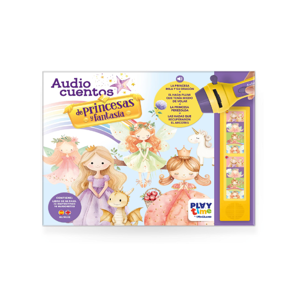 El Proyector Audiocuentos Imagiland incluye un libro ilustrado de 68 páginas con cuentos disponibles en español e inglés. Entre sus historias destacan títulos como La princesa Mila y su dragón, El hada Plumi que tenía miedo de volar y Las hadas que recuperaron el arcoíris. Estos relatos están pensados para captar la atención de los niños y ayudarles a desarrollar habilidades lingüísticas en ambos idiomas.