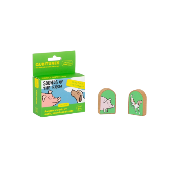 Solo tienes que colocar los bloques de madera en el escenario Qubitunes Play Stage (se vende por separado) junto con el juego base Qubitunes Sounds of the Farm, y escuchar cómo el cerdito oinkea y el perro ladra al ritmo de tu granja. ¡Mezcla y combina para crear tu propia sinfonía campestre!