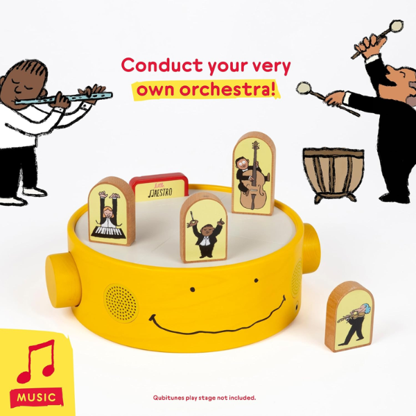 Diseñado para utilizarse con el Qubitunes Play Stage (se vende por separado), Little Maestro permite a los pequeños músicos colocar los bloques de madera de los compositores sobre el escenario y darles vida con sonidos e instrumentos que transforman cada interpretación en una obra única. Cada movimiento cambia la melodía, ofreciendo infinitas combinaciones musicales y versiones personalizadas de las sinfonías más famosas.