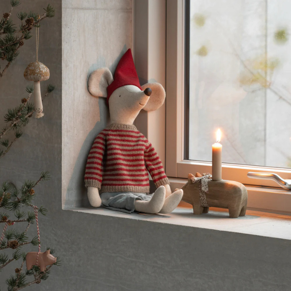 Haz que esta Navidad sea más mágica con el Ratón de Navidad Maxi —el compañero perfecto para los ratones de menor tamaño de Maileg y una joya decorativa llena de ternura y espíritu navideño.