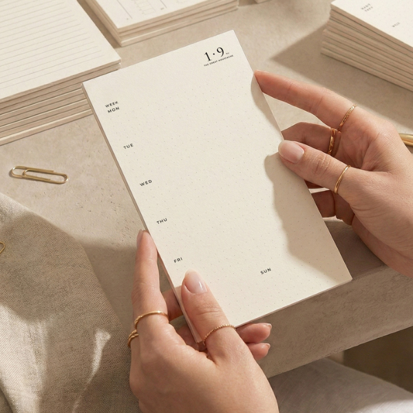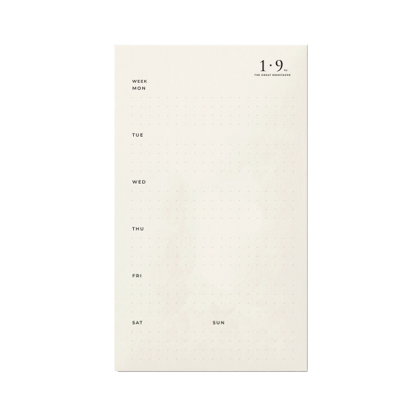 Con un tamaño de 100 × 175 mm, las tarjetas encajan perfectamente en el sistema 1·9, asegurando una integración natural y cómoda en tu rutina de organización.