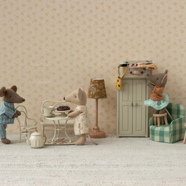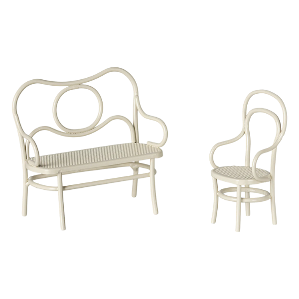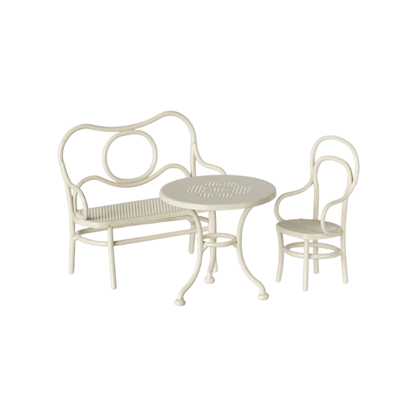 Con un diseño cuidadosamente elaborado en metal resistente, este set combina la delicadeza estética con la durabilidad, ofreciendo un mobiliario de aspecto atemporal que complementa a la perfección el universo de juego Maileg. El color blanco hueso aporta un aire de elegancia vintage, evocando los interiores de las casas escandinavas tradicionales, donde cada pieza está pensada para durar y transmitir calidez.