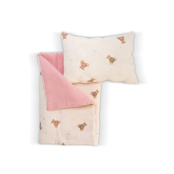 El Set Edredón y Almohada Teddy Musa Rosa incluye un edredón acolchado de 56 x 31 cm y una almohada rellena diseñada específicamente para ajustarse a las camas de muñecos. Este tamaño ideal garantiza un ajuste perfecto y permite que los muñecos estén cómodos mientras las niñas decoran sus camas y recrean escenas de cuidado y descanso.