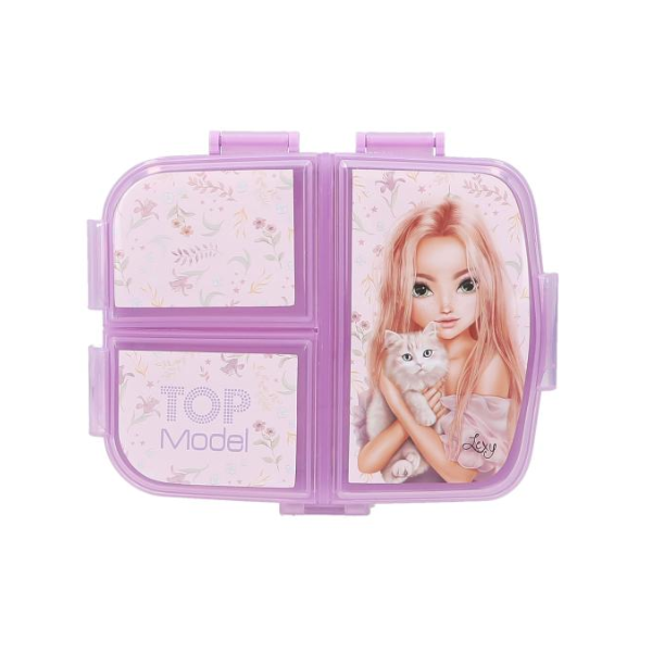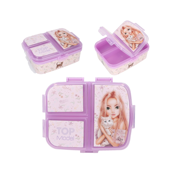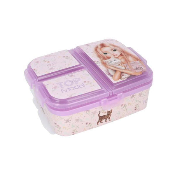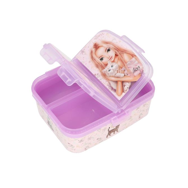 El diseño del Táper XL Blooming Kitty TopModel es otro de sus grandes atractivos. Está decorado con un bonito motivo de una modelo acompañada de un gato, junto con ilustraciones de pequeños gatitos y delicadas flores en los laterales. Esta estética lo convierte en un accesorio atractivo y original, ideal para niños que buscan un toque divertido y personalizado en su material escolar.