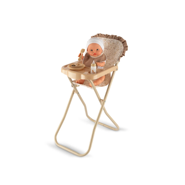 Uno de los principales atributos de esta trona es su diseño cuidado y resistente. Está fabricada con una estructura metálica lacada en color beige que garantiza estabilidad y durabilidad durante el uso. La bandeja de plástico a juego facilita la simulación de la alimentación del muñeco, aportando realismo a la experiencia de juego.