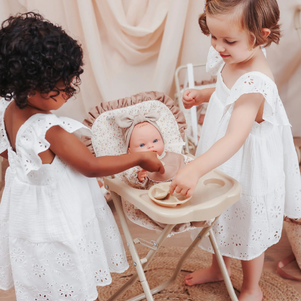 La Trona con Bandeja y Babero Colección Teresa está pensada para recrear momentos cotidianos como la hora de la comida, permitiendo a los niños reproducir situaciones reales de cuidado y alimentación de sus muñecos. Este tipo de juego de imitación es fundamental en el desarrollo infantil, ya que fomenta la empatía, la responsabilidad y las habilidades sociales.